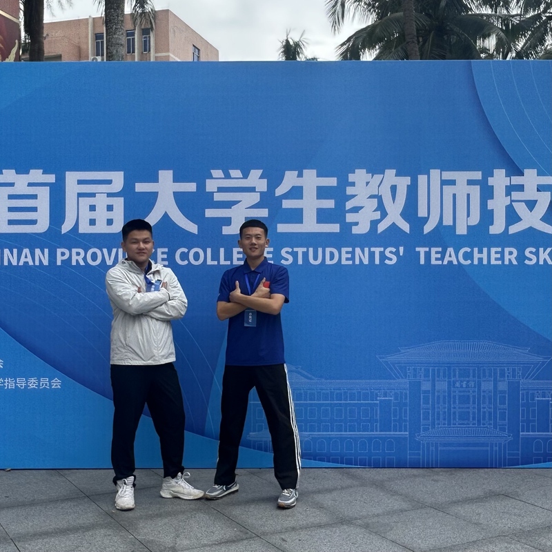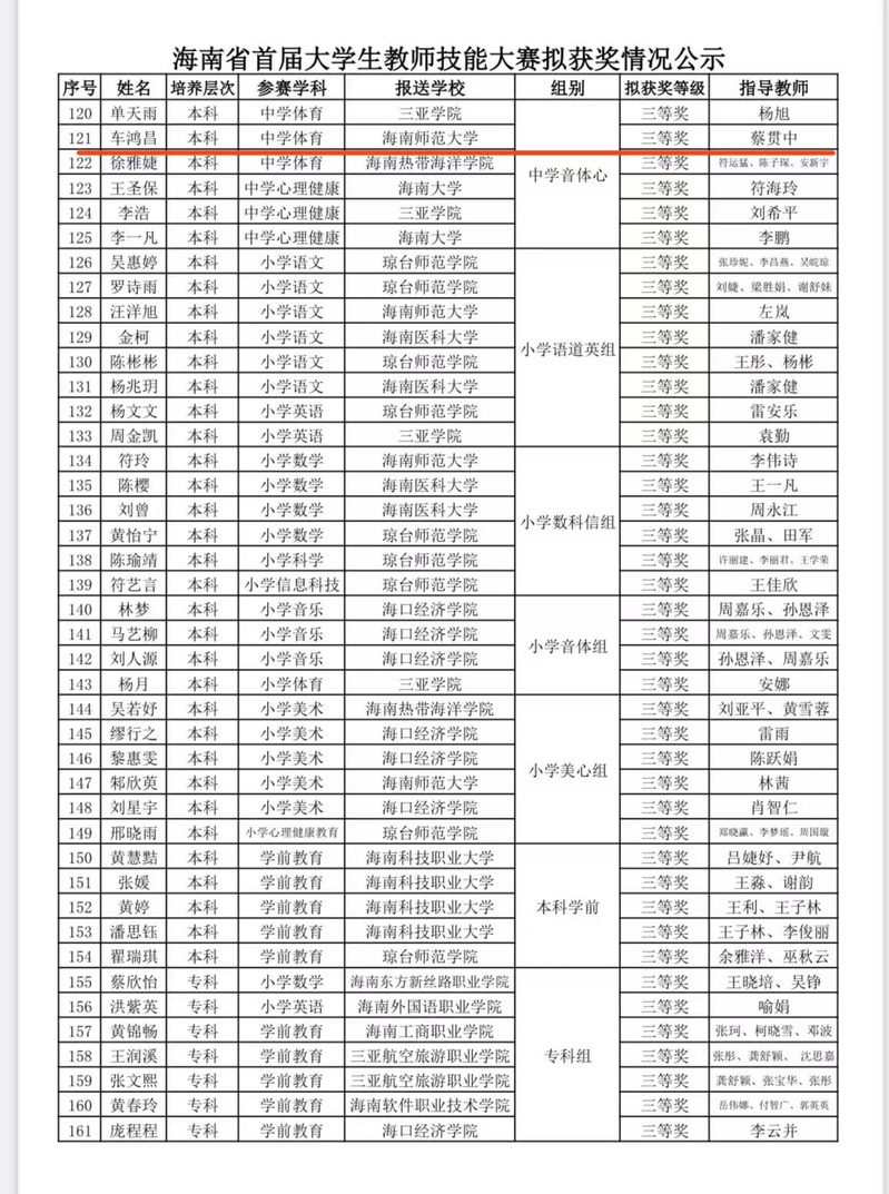 2025年11月23日,海南省首届大学生教师技能大赛圆满落幕。我院学子表现亮眼,刁跃航同学(指导教师张艺博)夺得中学音体心组一等奖第一名,车鸿昌同学(指导教师蔡贯中)荣获该组别三等奖。